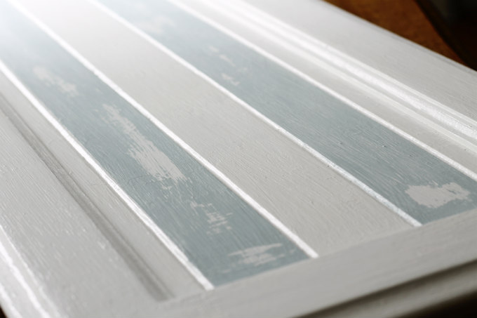 I covered up the ‘fresh berries’ lettering with white paint and then I added some blue stripes by using painters tape on the already indented slats. I brushed on a really light coat of a pretty blue paint that I had on hand.
